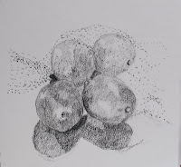 I had fun with drawing and am beginning to feel a little more relaxed. I used a soft charcoal pencil with this drawing. I tried to capture the mesh bag that the lemons were spilling out of.
